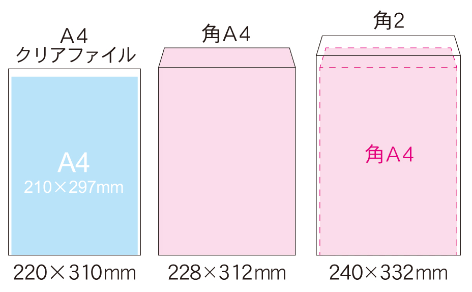 角2のサイズが「240×332㎜」に対して、角A4のサイズは「228×312mm」と小さめ。